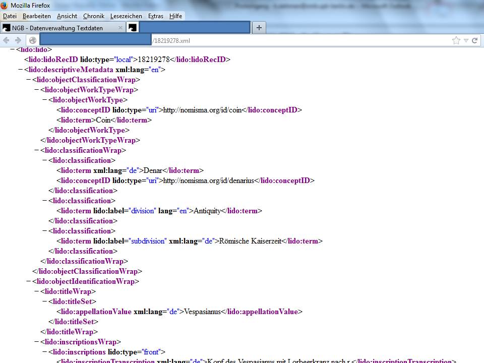 Hierzu werden jeweils aktualisiert die bereits freigestellten Datensätze im LIDO-Format dem jeweiligen Portalbetreiber zur Verfügung gestellt. Der Datenexport enthält neben den Grunddaten zum Objekt, digitalen Aufnahmen und detaillierten Beschreibungen auch sämtliche vorhandenen Normdaten (z.B. zu Münzherren, Nominalen, Geodaten usw.). Die Nutzung dieser Normdaten ist die Voraussetzung für den Austausch dieser Daten auf gemeinsamen Plattformen, welche von Museen aus verschiedenen Ländern für eine gemeinsame Suchmaske und Oberfläche bereitgestellt werden.